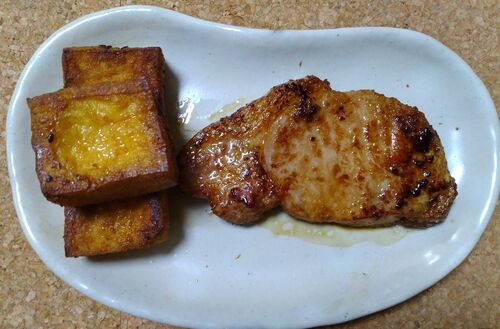 【概要】 トンテキを生姜焼きの味付けにしたもの。のこり油で厚揚げも焼いた。 【材料】 (1)豚ロース トンテキ用 2枚 (2)厚揚げ 1パック (3)醤油 大さじ1杯 (4)おろし生姜 チューブ 多め (5)料理酒 大さじ1杯 (6)サラダ油 小さじ2杯 【手順】 (1)豚肉をビニ…