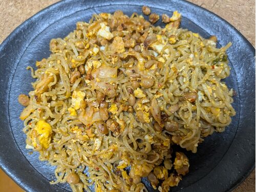 【概要】 モロヘイヤ麺と卵とキムチと納豆を炒めあわせたもの 【材料】 (1)モロヘイヤ麺 1食分 (2)卵 1個 (3)キムチ 小1パック (4)納豆 1パック (5)サラダ油 適宜 (6)塩 適宜 (7)胡椒 適宜 【手順】 (1)フライパンに油をひき、キムチと納豆を炒める。 (2)茹…