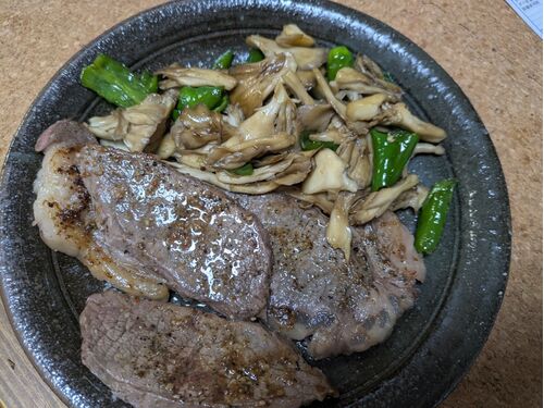 【概要】 ステーキと舞茸と万願寺唐辛子 【材料】 (1)ステーキ肉 適宜 (2)舞茸 1パック (3)万願寺唐辛子 3本 (4)バター 1かけ (5)にんにく 1かけ (6)オリーブオイル 適宜 (7)塩 適宜 (8)胡椒 適宜 (9)醤油 適宜 【手順】 (1)肉に塩胡椒をふっておく。 (2)…