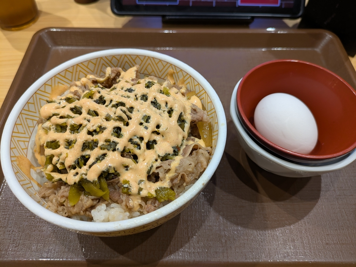 京橋駅近くの「すき家」で高菜明太牛丼。